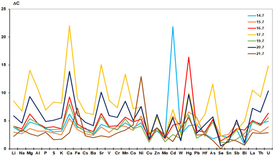 Figure 13 shows the geochemical profiles of elements in the composition of a surface aerosol during an episode of extreme aerosol pollution in July 2021 under the influence of close local source. Geochemical profiles are presented in relative units (Formula (2))—the relative excess in the element mass concentration ΔC in the days with the highest intensity of the local source compared to CBG on Sunday 18 July 2021 (chosen as a background, in undisturbed conditions, with a non-working local source).