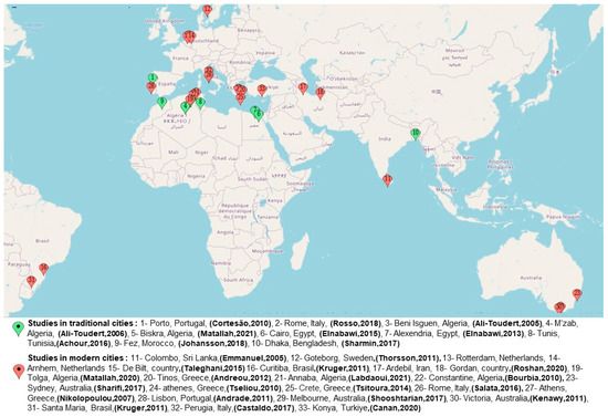 Review of the literature on outdoor thermal comfort in traditional and modern cities. Studies in traditional cities: 1—Porto, Portugal, [47], 2—Rome, Italy, [48], 3—Beni Isguen, Algeria, [39], 4—M’zab, Algeria, [38], 5—Biskra, Algeria, [44], 6—Cairo, Egypt, [42], 7—Alexendria, Egypt, [43], 8—Tunis, Tunisia, [41], 9—Fez, Morocco, [40], 10—Dhaka, Bengladesh, [14]. Studies in modern cities: 11—Colombo, Sri Lanka, [7], 12—Goteborg, Sweden, [24], 13—Rotterdam, Netherlands, [26], 14—Arnhem, Netherlands, [26], 15—De Bilt, country, [26], 16—Curitiba, Brasil, [13], 17—Ardebil, Iran, [31], 18—Gordan, country, [31], 19—Tolga, Algeria, [30], 20—Tinos, Greece, [51], 21—Annaba, Algeria, [52], 22—Constantine, Algeria, [23], 23—Sydney, Australia, [53], 24—Athenes, Greece, [54], 25—Crete, Greece, [55], 26—Rome, Italy, [56], 27—Athens, Greece, [57], 28—Lisbon, Portugal, [58], 29—Melbourne, Australia, [59], 30—Victoria, Australia, [60], 31—Santa Maria, Brasil, [13], 32—Perugia, Italy, [50], 33—Konya, Turkiye, [61].
