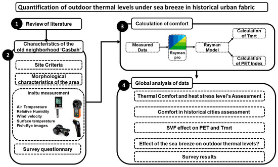 A conceptual framework was developed that summarizes and visualizes the research methodology of this study. As shown in Figure 2, the conceptual study framework is based on three methods, combining a literature review, in situ measurement of microclimatic data, and a calculation process to assess the thermal comfort levels in the urban fabric. Each step is described in detail in Section 2.1, Section 2.2 and Section 2.3.