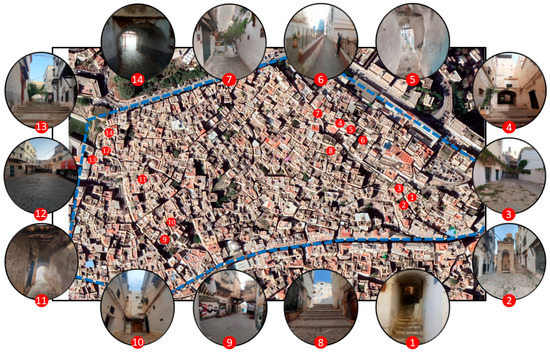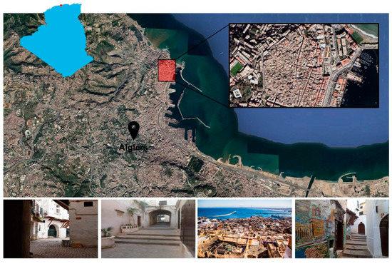 The study was conducted in the Casbah of Algiers, situated in the north of Algeria (36°47′00″ N, 3°03′37″ E) at an elevation of 107 m (Figure 3). The Casbah is the historic center of the city of Algiers and a historic neighborhood listed as a world heritage site by UNESCO (United Nations Educational, Scientific and Cultural Organization) since 1992. It represents a type of morphology of traditional Islamic architecture construction. The building materials are generally local (terracotta, lime) [62,63]. The upper part of the Casbah overlooks the sea; the buildings are dense and the streets winding. There are residential areas with local shops and oratories. The lower part is adjacent to the coast [64], and the layout of the roads is more regular, following an orderly route. Its proximity to the city gates favors the concentration of its economic, spiritual, political, and administrative functions. The urban space is subdivided into several subspaces, which is one of the characteristics of the traditional urban space (Figure 3). For this study, the Permanent Plan for the Safeguarding and Enhancing Safeguarded Sectors PPSMVSS) for the Casbah was consulted at the National Office for the Management and Exploitation of Protected Cultural Assets (OGEBC) and several google maps and satellite images. Our study was focused on the residential area of the Upper Casbah.