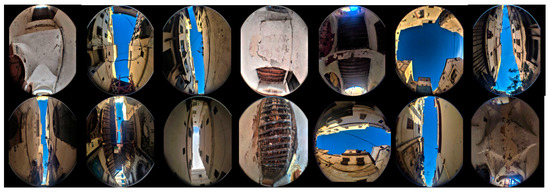 The shared dataset [74] gathered meteorological data measured during the referenced weeks. Figure A1 shows the distribution of the average daily air temperature in the measurement points. Table 4 is an example of the measured data summarized in the figure. Fish-eye images used in the data inputs to calculate the sky view factor, taken by Canon EOS 1100D cameras, are summarized in Figure 5 according to the order of the measurement points.