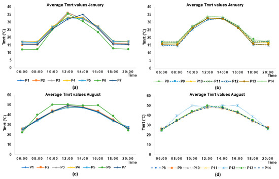 The average daily mean radiant temperature distribution at the 14 points studied in January (a,b) and August (c,d) 2021.