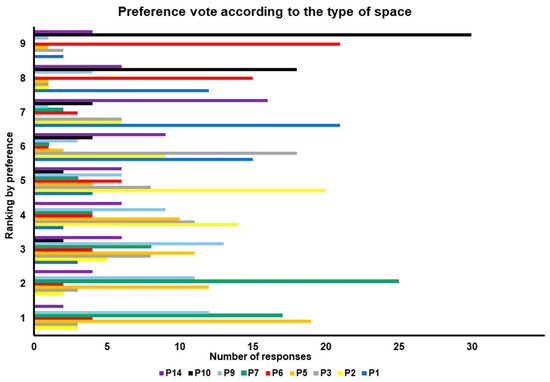 According to our observations and based on 60 respondents, the air temperature and humidity have the most significant impact on daily comfort (Figure A2). Figure A3 shows the point pleasantness scale in the subspaces for different parameters (air temperature, humidity, wind speed, shading, and sun effect). Point 5 stands out with the most positive votes on the pleasantness scale. Figure 7 shows the users’ preferences for subspaces. As stated by the results of the votes, the subspaces are distributed into three categories—the most comfortable (ranging from 1 to 2), moderately comfortable (ranging from 3 to 6), and the least comfortable (7 to 9).