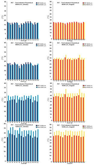 The Tmrt values are very sensitive to solar radiation hours. Figure 6 shows the mean radiant temperature in January and August in the 14 measurement points. In January, three phases are observed in the graph. First, there were stable temperatures during sunrise and sunset (6:00 a.m. to 8:00 a.m.; 6:00 p.m. to 8:00 p.m.), then an increase in Tmrt values all morning long (8:00 a.m. to 12:00 p.m.). Lastly, there was a drop in temperature during the afternoon (2:00 p.m. to 6:00 p.m.). However, in August, the graph shows two phases—an increase in temperature from 6:00 a.m. to 12:00 p.m. and a decrease from 2:00 p.m. to 8:00 p.m. The highest values in January (35 °C) were recorded at points 2 and 6 at 12:00 p.m. and at point 7 at 2:00 p.m. In August, extreme values (>50 °C) were recorded at points 6 and 12.