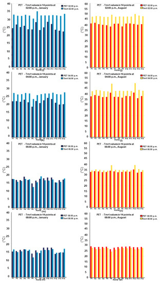 In January, the curves of the measured points are parallel with a maximum interval of 3 °C. Curve 6 presents the specific variations strongly affected by the daylight hours, going from the coldest point (12 °C) at 6:00 a.m., to the hottest point (35.5 °C) at 12:00 p.m. For August, all the curves show the same development, except for points 6 and 12, which recorded the highest temperatures during the day (8:00 a.m. to 6:00 p.m.). Figure 6 shows that point 6 is the least comfortable in January, with extremely low temperatures, and in August, with temperatures above average by ≈4 °C.