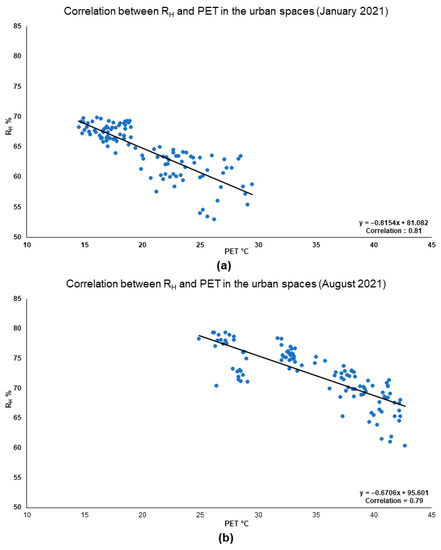 The mean radiant temperature was calculated by Rayman software using the following parameters: air temperature, relative humidity, and surface temperature, as well as fish-eye images. This was done based on the meteorological parameters and the location of interest. The validation of the results of the Rayman calculation is in agreement with similar results obtained from experimental studies [75]. This is why Rayman software, as described in all papers by Matzarakis, does not use the globe temperature for calculating the mean radiant temperature.