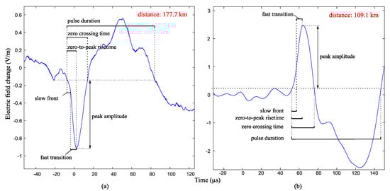 Figure 1a shows an example of a return stroke of a +CG flash detected on 24 January at 22:02 located 177.4 km from the measurement station, while Figure 1b shows an example of a return stroke of a −CG flash detected on 15 January at 07:46 located 109.1 km from the measurement station. At the initial rising part of the return stroke, two parameters were observed that comprised slow rising parts known as slow front, followed by a relatively fast rise to the peak, known as fast transition. The breakpoint between these two parameters is normally around 50% from the initial of the return stroke to its peak for the first return stroke, while the subsequent return stroke has a breakpoint of 20% []. For the third observation, the zero-to-peak rise time is defined as the duration between the initial of the return stroke to its highest peak of return stroke. The fourth observed parameter is the zero-crossing time which can be defined as the time when the radiation field crosses the zero line, as depicted in Figure 1a,b. Lastly, the pulse duration of the return stroke, defined as the time when radiation field of return stroke completes one cycle, was also measured.