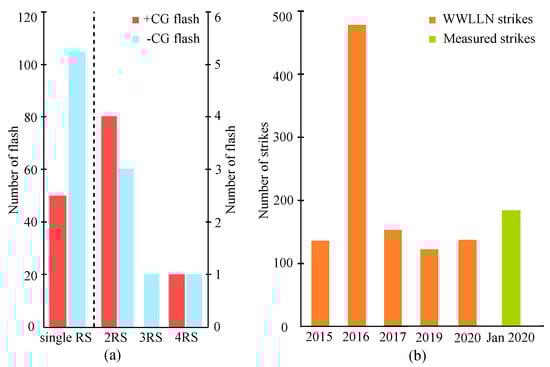 (a) Distribution of CG flashes recorded in Antarctica based on its polarities; (b) total number of lightning strikes; orange represents worldwide lightning location network (WWLLN) annual lightning strikes distribution between 2015 and 2020, while the green column represents total CG lightning strokes in King Sejong Station recorded by our lightning measurement station between 11 and 31 January 2020 in Antarctica.