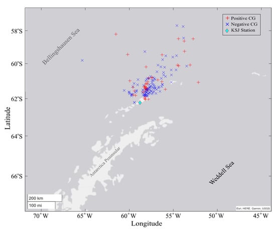 A recent study reported lightning occurrences in the Arctic based on Worldwide Lightning Location Network (WWLLN) data []. The trend of annual total lightning strikes has been incremental in the past 10 years, where the annual lightning strikes increased from 30,000 in 2010 to 240,000 in 2020. Another study reported lightning occurrences in western Antarctica using a commercial Boltek Lightning Detector []. During their experiments between February and December 2017, a total of 43% positive cloud-to-ground (+CG) and 57% negative cloud-to-ground (−CG) flashes were detected. Most of the flashes were detected between February and May (summer and autumn), accounting for around 96% of the total CG flashes. The authors recorded more +CG flashes in the Antarctica Peninsula compared to other regions. For comparison, the percentages of detected +CG were 8.4% in Uppsala, Sweden (59.9°, 2009 to 2014) [], 5.4% in Hubei province, China (29.0° to 33.3°, 2006 to 2012) [], and 0.8% in Skudai, Malaysia (1.6°, April to May 2009 and November to December 2012) []. It has been suggested that the occurrence of +CG flashes is latitude-dependent []. Since thunderstorms in high latitudes have lower cloud tops (lower tropopause layer) and mixed-phase regions compared to storms in the tropics, more +CG occurrence would be expected to be detected in high latitudes than in the tropics. Therefore, since Antarctica is located at a latitude higher than the polar circle (60°), the amount of +CG flashes should be significant.