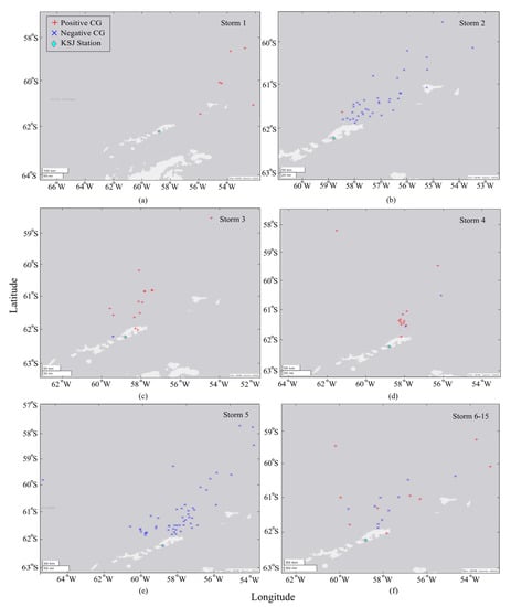 Figure 3 shows the locations of the return strokes of +CG (red plots) and −CG (blue plots) flashes located between 32 and 530 km and between 32 and 569 km, respectively. A total of 129 return strokes were located northeast of the measurement station, two return strokes were located southwest, and 22 return strokes were located northwest of the measurement station. Almost all lightning strikes located by our measurement station occurred over the ocean. The measurements of lightning flashes throughout the month of January have been classified into 15 storms, where five of them are shown individually in Figure 4a–e, while Figure 4f shows a combination of the remaining 10 storms with fewer counts of lightning strikes.