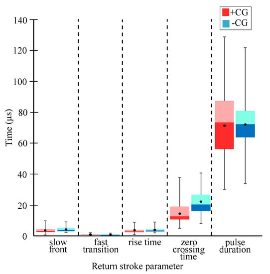 Table A1 and Table A2 and Figure 5 tabulate the statistics of temporal characteristics of the first return strokes and subsequent return strokes of both +CG and −CG flashes. The minimum slow front duration of −CG flashes is 3.4 times longer compared to +CG flash, while the maximum values were comparable. The arithmetic mean (AM) and geometric mean (GM) values of slow front duration for −CG flashes were 11.7% and 18% longer compared to +CG flashes, respectively. For the 10–90% risetime duration, the AM and GM durations of −CG flashes were slightly higher, by 6.3% and 13.7%, than +CG flashes, respectively. For the zero-crossing time, −CG flashes had longer duration compared to +CG flashes. The AM and GM values of the normalized electric fields of +CG flash are 23.5% and 35.0% higher compared to −CG flashes.