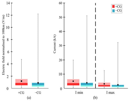 (a) Electric field intensity normalized to 100 km for +CG (red box) and −CG (cyan/blue box); (b) estimated positive and negative CG minimum and maximum peak currents.