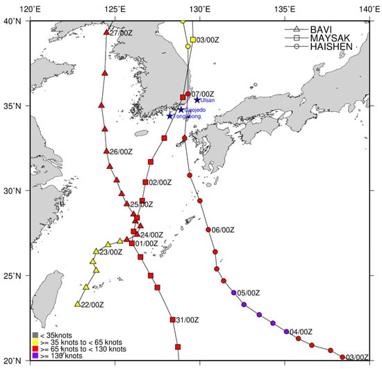 Typhoon tracks of Bavi, Maysak, and Haishen and the locations of wave observation buoys (blue stars). Here, time information of tracks is formatted as date/hour in UTC.
