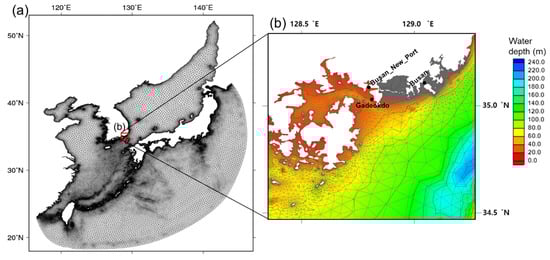 The model domain of ADCIRC+SWAN is composed of 469,421 nodes and 904,006 elements (Figure 2). The model grid is non-uniform, allowing desired areas to be fine and undesired areas to be coarse. Therefore, the study area of the south coast of Korea was created with a grid of at least 10 m, and the grid size was gradually increased to make an open boundary of about 30 km grid. Moreover, to improve the prediction of the storm surge and waves, this study used the topographic and bathymetric data provided by the National Geographic Information Institute (NGII), Korea Hydrographic and Oceanographic Agency (KHOA), and Busan.