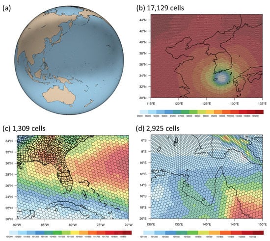 MPAS meshes used in this study: (a) global view of variable resolution (60–15 km), where the gray zone over East Asia and the northeast Pacific region has a finer resolution of 15 km; (b) high resolution meshes over Korea where there are 17,129 cells within the plot; (c) coarse resolution meshes over Florida where there are only 1309 cells in the plot; (d) transient resolution meshes over northern Australia where there are 2925 cells in the plot. Shadings of (b–d) indicate the 36 h forecast of mean sea-level pressure valid at 12UTC on 2 September 2020.
