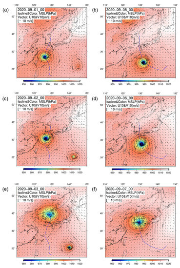 Ten meter wind (arrows) and surface pressure fields (shadings) simulated by MPAS, and the typhoon best track of JTWC (thick blue lines). (a,c,e) the forecast result from 00 UTC on 1 September for typhoon Maysak, (b,d,f) that from 00 UTC on 5 September for typhoon Haishen.