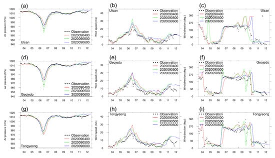 Comparison of the MPAS forecast with the observations (Ulsan, Geojedo, and Tongyeong) for the case of Haishen in 2020. (a,d,g) surface pressure (hPa); (b,e,h) wind speed (m/s); (c,f,i) wind direction (degree). Here, the x-axis indicates the time with the date of the simulation period, and the interval of observation data is one hour.