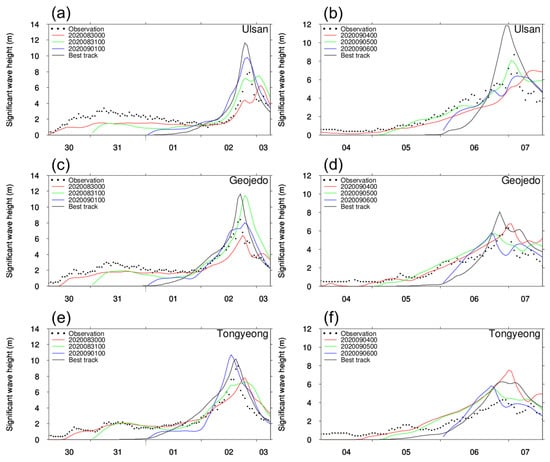 Figure 6 shows the verification of the MPAS simulation for typhoon Haishen. Accurate comparisons were also found at three wave buoys for typhoon Haishen; thus, the wind and surface pressure of typhoon Haishen were also accurately forecasted on the south coast of Korea. Even the earliest forecast case ‘2020090400’ (approximately 3 days before landfall) was adequately predicted, which is promising.