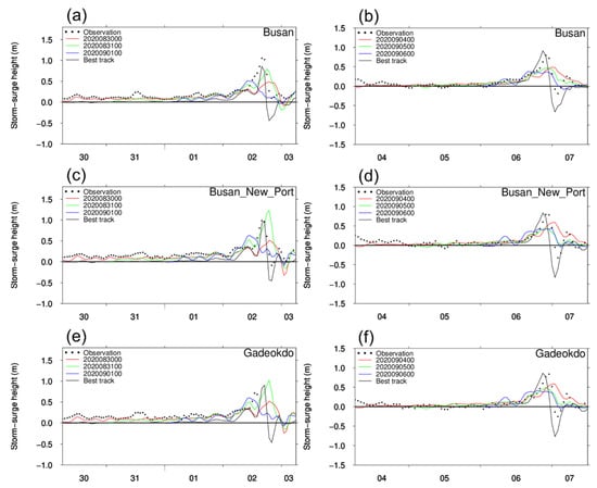 Comparison of the MPAS forecast and the hindcast with the tide observation stations (Busan, Busan_New_Port, and Gadeokdo) of storm surge height for typhoons Maysak (a,c,e) and Haishen (b,d,f). Here, the x-axis indicates the time with the date of the simulation period, and the interval of observation data is one hour.