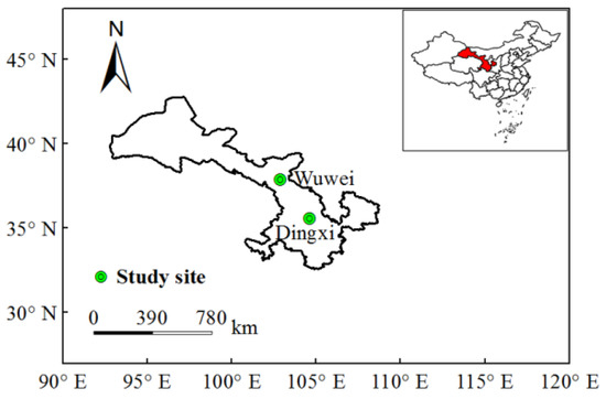 The experimental materials were the spring wheat varieties “Dingxi Xin 24” (at Dingxi Station) and “Yongliang 4” (at Wuwei Station). Pot experiments were carried out in these two sites (Figure 1), and the pots were placed in the field environment. Leaf physiology experiments in 2015 and leaf photosynthetic biochemical experiments in 2017 and 2021 were conducted at the Dingxi Arid Meteorology and Ecological Environment Field Science Experiment Base of the China Meteorological Administration (35°35′ N, 104°37′ E, altitude 1896.7 m). The base belongs to a semi-arid climate zone on the Loess Plateau. The annual average temperature is 6.7 °C. The annual rainfall is about 386 mm. The annual sunshine hours are 2500 h. The frost-free period is 140 days. The soil texture is loessial. The PH value is 7.8. The organic matter content is 110.7 g/kg. The average soil bulk density of 0–100 cm layers is 1.25 g/cm3, the field water holding capacity is 25.0%, and the withering humidity is 5.2%. Leaf physiology experiments in 2017 were conducted at the Wuwei Desert Ecology and Agricultural Meteorological Experiment Station of Gansu Province (37°53′ N, 102°53′ E, altitude 1534.8 m). The experimental station has an average annual temperature of 8.5 °C, annual precipitation of about 171 mm, annual sunshine hours of 2873 h, a frost-free period of 150 days, a soil texture of sandy loam, a pH value of 8.3, an organic matter content of 7g/kg, an average soil bulk density of 0–100 cm layers of 1.74 g/cm3, a field water holding capacity of 21.1%, and a withering humidity of 5.6%. The potting soil was taken from the 0-30 cm cultivated soil in the field, dried and sieved, mixed with fertilizer, and put into a bucket-shaped planting pot with a diameter of 29 cm and a depth of 45 cm. The weight of the dry soil and the bucket were respectively weighed and recorded.