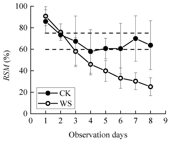 Sowing was carried out in mid-March or late March of the experiment year. A quantity of 0.9 g seeds (about 30 grains) were evenly sown in each bucket, with a sowing depth of about 5 cm. During the early stage of growth, uniform and adequate watering was carried out until the critical period of water demand for spring wheat (joint to heading stage) in which the buckets should be weighed daily for water treatment. The specific two treatments were the control group (CK), in which the pots were irrigated every day until the relative soil moisture reached the field water holding capacity, and the continuous drought group (WS), in which the pots were kept un-watered after observation until the plants wilted or died (Figure 2). An electric canopy or plastic sheet was used to cover them from the rain automatically or manually. We set three repetitions for each treatment. Observation ended when the photosynthetic rate of the WS group approached 0. During the drought process, the change of RSM is shown in Figure 3.