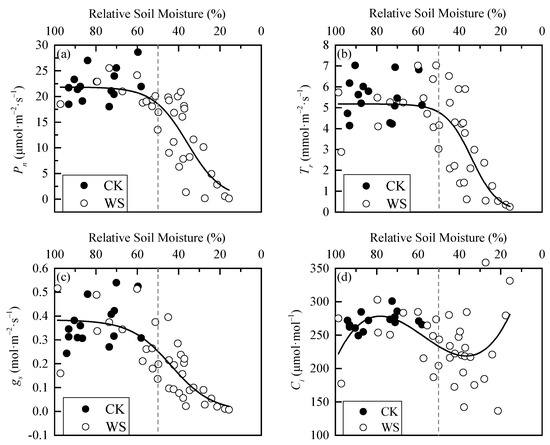 According to the characteristic of scatter plot for each parameter (S-type or cubic polynomial type), logistic and cubic polynomial models were selected to fit the data of WS. The effects of the fitted curves are shown in the black solid lines in Figure 4, and the statistical results are shown in Table 2. It can be seen from adjusting the R2 and the F test that the fitting effects of Pn, Tr, and gs were good, and Ci was slightly inferior due to its discrete data (Figure 4d). However, the simulation curve trend of the second half of Ci was basically consistent with the response characteristics after entering the drought process. Therefore, the curve was still valid for determining the threshold.
