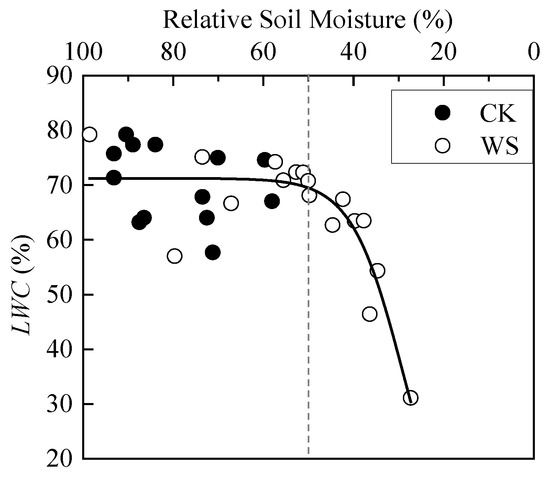 Dynamics of leaf water content of spring wheat under different relative soil moistures. CK refers to the control group. WS refers to the continuous drought group. The grey dashed line is the reference line of 50% relative soil moisture.