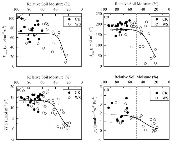 Under rapid-drought stress, RSM also had a threshold effect on the photosynthetic biochemical parameters of spring wheat leaves. Before the RSM was about 50%, the parameter values fluctuated around the mean values Then, they decreased sharply after 50%. Finally, their decrease rates slowed down after a certain threshold. Their curves appeared overall as S-shapes (Figure 6). The difference of each parameter between CK and WS was extremely significant, indicating that rapid-drought stress also significantly affects the leaf photosynthetic biochemical parameters of spring wheat (Table 5). The logistic model was used to perform curve-fitting on each parameter, and the fitting effects were all good (Table 6).