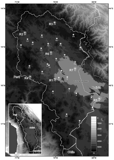 - OEA (Organización de los Estados Americanos)/PNUMA (Programa de las Naciones Unidas para el Medio Ambiente). Diagnóstico Ambiental del Sistema Titicaca-Desaguadero-Poopó-Salar de Copaisa (Sistema TDPS) Bolivia-Perú; OEA: Washington, DC, USA, 1996; p. 192. [Google Scholar]