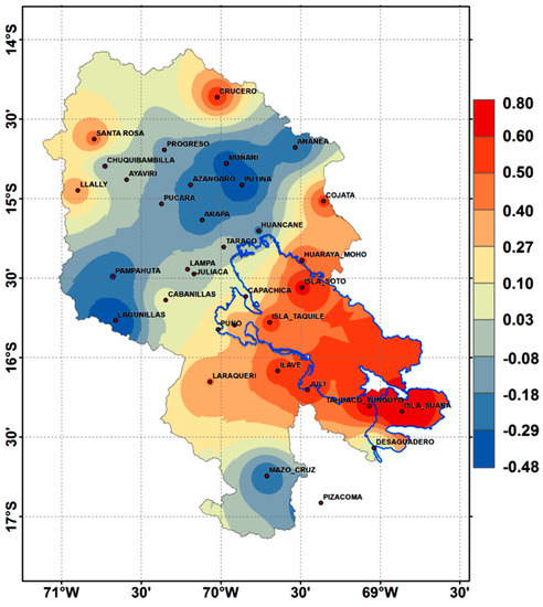 - The bias underestimation was observed over most of the LTb areas and overestimation (e.g., Lagunillas, Isla Suana, and Desaguadero stations). The total bias decreases when approaching the lake attaining its minimum value over the mountains [4,5]. In addition, the high resolution of the CMORPH data can depict finer regional details, such as a less coherent phase pattern over a few regions (e.g., Isla Suana).