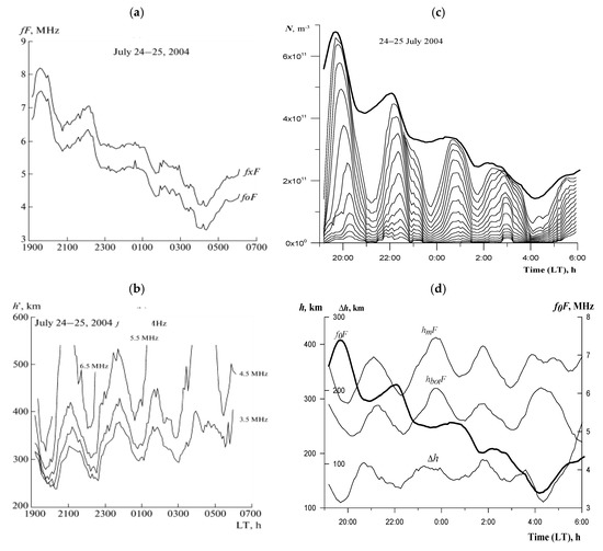 Figure 1c illustrates the smoothed variations of the ionospheric electron concentration (N(t)) for the considered night at a series of heights. The lower curve corresponds to the height of the layer bottom (hbot = 190 km). The upper (thick) curve corresponds to variations in Nm(t) at the maximum of the F2-layer. To eliminate high-frequency components, both of ionospheric origin and those caused by noise arising during processing, low-frequency filtering of the series was carried out using a sliding window with a length T = 60 min. An analysis of the phase relationships between the variation peaks in foF, hmF, hbotF, Δh shown in Figure 1d gives the following results. Peaks of variations in foF (and, consequently, electron concentration) occur when the true height of the F2-layer maximum decreases and at the same time, when the half-thickness of the F2-layer reaches a minimum, i.e., at the moment of maximum compression of the ionosphere. An explanation of the phase relationships between variations of ionospheric parameters is given in [15]. The given phase relationships between the considered layer parameters (foF2, hmF, hbotF, Δh) are also preserved for other observation sessions with intense wave activity, for which time variations of these parameters were built.