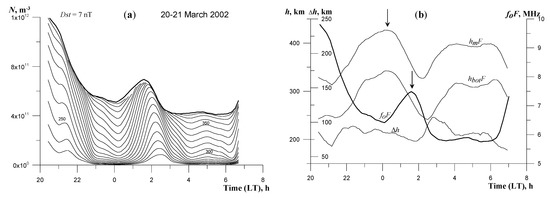 The probability of formation of nighttime enhancements is very high. On average, it reaches 50%, and in the winter months it can exceed 80% [4,6]. We used the Dst index to assess the geomagnetic activity. The value Dst = 7 shown in Figure 2a represented the maximum value of the index, which occurred in the time interval starting several hours before the beginning of the recorded enhancement in the electron concentration and ending at the end of the enhancement. The choice of the boundaries of the interval for estimating the value of geomagnetic activity, which can be related to the observed phenomenon, is determined by the fact that the usual propagation time of disturbances from polar to middle latitudes is ~2–3 h [1].