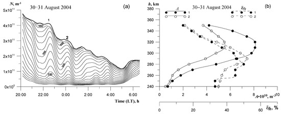 In the previous sections, we studied two types of ionospheric disturbances characterized by different physical mechanisms of their generation. The sources of ionospheric variability listed above demonstrate similar reactions of the ionosphere associated with the temporal expansion and upward rise of the F2-layer and its fall, accompanied by its compression, giving a NmF peak at the moment of maximum compression. In this section, the height profiles of the disturbance amplitudes are compared. To study the height profiles of the LSTID amplitudes for the period 2000–2008 observation sessions were selected, during which perturbations with the relative amplitude (Δh) exceeding 25% were recorded at a height corresponding to Am. Here, Δh = A(h)/N(h), where A(h) is the absolute wave amplitude at the height h and N(h) is the unperturbed electron concentration at the given height. The selection of observation sessions, during which LSTIDs with large absolute and relative amplitudes were recorded, ensured high accuracy in constructing altitude profiles of amplitudes even near the heights of the layer bottom, which are characterized by small values of A(h) and N(h). There were 63 such sessions in total. Figure 3a illustrates an example of variations in the electron concentration N(t) for the night of 30–31 August 2004 at a series of heights with a distance between adjacent heights of 10 km. The lower curve corresponds to the height of the bottom of the layer (h = 190 km).