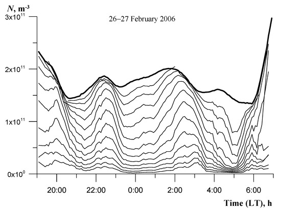 Figure 4 illustrates an example of the behavior of the parameters of the nighttime F2-layer, which represents the sequence of the first (t~20:40–22:25) and the second (t~23:10–02:00) enhancements in the electron concentration. The drop in the electron concentration at the beginning of the measurement session is due to the switching off of the ionizing radiation of the Sun after its sunset and chemical losses due to plasma recombination. The rapid increase in the electron concentration in the morning after 06:00 is due to sunrise. The behavior of the electron concentration at a number of fixed heights makes it possible to obtain the height dependence (profile) of the enhancement peak-to-peak value. Here, by the term peak-to-peak value, we mean the difference in electron concentrations at the enhancement maximum (t = 22:30) and at the beginning of the enhancement (t = 20:40).