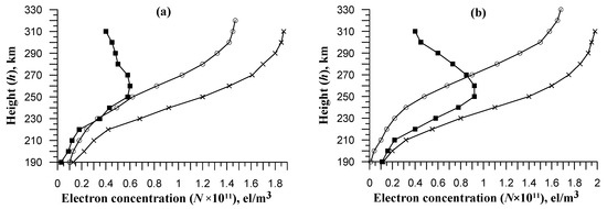 Figure 5 illustrates the height profiles of the enhancement peak-to-peak value for the first (a) and second (b) enhancement and the N(h)-profiles for the beginning and end of the enhancements, calculated from the variations of N(t) shown in Figure 4. In the measurement session shown in Figure 4, the height corresponding to the maximum peak-to-peak value, both for the 1st and for the 2nd enhancement, turned out to be 260 km. An analysis of the entire volume of observations showed that those considered in Figure 4 features are preserved during the formation of enhancements and on other dates falling on different seasons and years under different levels of solar activity.