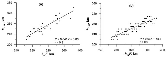 Figure 6a is a scatterplot between the height hAm corresponding to the maximum peak-to-peak value and the height of the maximum hmF of the layer. The interval of heights at which the maximum peak-to-peak value was observed for the entire array of analyzed sessions turned out to be very wide. The regression line calculated by the least squares method is shown as a solid line. The expression for this line and the value of the correlation coefficient r = 0.9 are presented at the top of the figure. It follows from the figure that the difference between hAm and hmF increases linearly with hmF. If for hmF = 280 km the difference is ~38 km, then for hmF = 380 km the difference is ~54 km. A similar behavior of the height corresponding to the maximum amplitude was also obtained for plasma perturbations generated by the LSTIDs (Figure 6b).