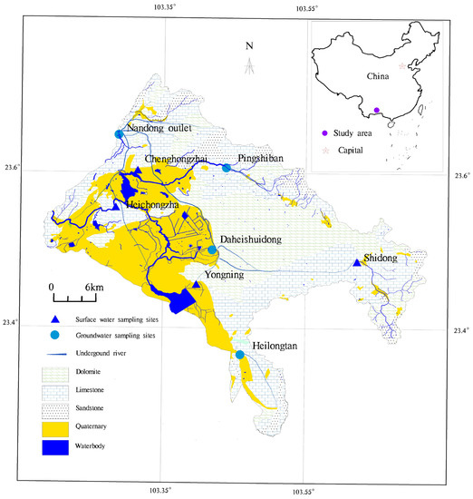 The global karst area accounts for approximately 15% of the total global land area, and approximately 25% of the world’s population relies on karst groundwater as the primary source for drinking and irrigation [1]. China is the country with the largest karst area distribution in the world, with karst area accounting for approximately 1/3 of the national land area, mainly in the southwest of China. Surface water and groundwater in karst areas are important water sources for local industrial and agricultural production and residential life. In the past decades, increasing environmental pollution caused by human activities [2], intentionally or unintentionally, has largely damaged sensitive karst ecosystems in many areas of China [3]. Karst aquifers constituting the main potable water resource are of heightened significance due to the increasing water demands and depletion of water resources [4].
