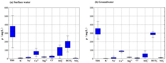The statistical results of the main indicators of water chemistry of groundwater and surface water in the study area are shown in Table 1 and Table 2, and the statistical characteristics of each ion are shown in Figure 2. The change of each major ion concentration was mainly influenced by the ion characteristics, the solubility of the compounds which was composed of ions, and its hydrogeochemical environment. The pH values of Groundwater ranged from 7.15 to 7.59, with an average value of 7.38, which was weakly alkaline. TDS in the groundwater and surface water varied from 229.22 mg/L to 437.23 mg/L, and its average value of groundwater was 317.19 mg/L, which was slightly greater than the average value of surface water (315.76), indicating that the groundwater and surface water were low mineralization water and fresh water, respectively. The overall water quality was relatively good.