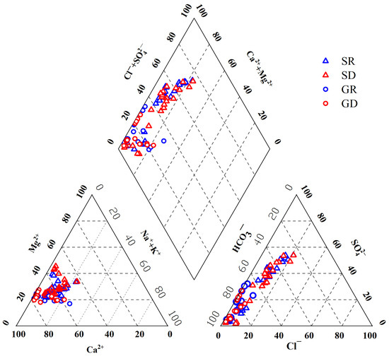 The correlation of water chemical components can reflect the consistency and difference between ionic components and reveal the material source of ions or the chemical reaction process that they undergo. The correlation of ions with the same material source or undergoing the same chemical reaction process is generally better. The Pearson correlation coefficient matrix is more frequently used to quantify the correlation of the components in hydrogeochemical studies. The Pearson correlation coefficient matrixes for surface water and groundwater chemical parameters in the study area are shown in Table 3. In surface water, K+, Na+, and Cl− showed a significant positive correlation with each other. Ca2+, Mg2+, and showed a highly significant positive correlation with each other. Ca2+ and showed a highly significant positive correlation with each other. In groundwater, K+, Na+, and Cl− showed a highly significant positive correlation with each other. Ca2+, Mg2+, and showed a highly significant positive correlation. Ca2+ and Mg2+ showed a highly significant positive correlation. This result reflected the sequence of dissolving rock components in water: chlorate was an easily soluble component, which meant that K+, Na+, and Cl− were dissolved into groundwater at the earliest, followed by sulfate, indicating that Ca2+, Mg2+, and were more difficult to be dissolved into groundwater, and the insoluble carbonate (Ca2+ and ) were finally transferred into the groundwater.