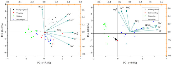 According to the principal component analysis of the major ions in surface water (Table 4, Figure 4), the cumulative variance of the first two components accounted for 71.33% of the total variance. The contribution of the first component was 47.11%, which was more correlated with K+, Mg2+, Cl−, , and . The contribution of the second component accounted for 24.23%, which was more correlated with Na+, Ca2+, and . According to the principal component analysis of the major groundwater ions (Table 4, Figure 4), the cumulative variance of the first two components accounted for 68.546% of the total variance. The first component accounted for 39.96% and was more correlated with K+, Na+, Cl−, and ; the second component accounted for 28.58% and was more correlated with Ca2+, Mg2+, , and .