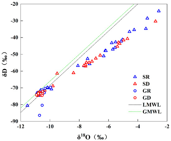 There were evident seasonal variations of hydrogen and oxygen stable isotopes in precipitation in the study area, with a negative bias in the rainy season and a heavy bias in the dry season, as well as an obvious rainfall effect [24]. The Local Meteoric Water Line (LMWL) equation (Equation (2)) was created on the basis of the precipitation isotope data from August 2014 to July 2015 as follows:
