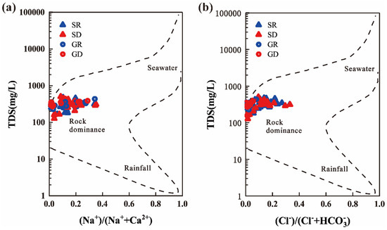 The Gibbs diagram is a qualitative study of the chemical composition and origin of natural waters. Gibbs and Feth [26,27] used the relationship diagrams of TDS − Na+/(Na+ + Ca2+) and TDS − Cl−/(Cl− + ) to classify natural waters into three main control types, namely, precipitation type, rock weathering dissolution filtration type, and evaporative concentration type. The water samples with low TDS and high cation concentration ratio (Na+/(Na+ + Ca2+) close to 1) are mainly distributed in the lower right corner of the Gibbs diagram, indicating that the water samples mainly receive recharge from precipitation. Water samples with medium TDS and low cation concentration ratio (Na+/(Na+ + Ca2+) generally less than or equal to 0.5) are mainly distributed in the left side of the middle of Gibbs diagram. This type of water samples’ composition is controlled by the weathering and filtration of rocks, and the composition of such water points mainly comes from the weathering hydrolysis of rocks and soils. The water samples with high TDS and high cation concentration ratio (Na+/(Na+ + Ca2+) close to 1) are distributed in the upper right corner of the Gibbs diagram, indicating that the water chemical composition of the water sample is controlled by the evaporative concentration. This type of water samples are generally distributed mainly in the arid areas where evaporation is strong. The same principle of analysis by anion concentration ratio (Cl−/(Cl− + )) can be used to check each other by comparative analysis of anions and cations.