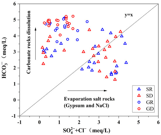 The Gibbs diagram demonstrates that the surface water and groundwater chemical components of NKWS were mainly controlled by water-rock interaction. The linear relationship between + Cl− and was used to further identify the controlling ratios of carbonate and evaporite rocks. The point located at the upper left side of the 1:1 relationship line is from carbonate karst, and the point located at the lower right side is from evaporite karst (gypsum and NaCl, etc.) [25]. As shown in Figure 7 shows that all 37 groundwater samples were distributed in the range of carbonate karst erosion. Half of the surface water samples fell into the range of carbonate karst erosion and half into the range of evaporite salt karst erosion. Considering that the sources of and Cl− in surface water included water-rock action, mineral mining, and agricultural farming, and combining with the distribution of mines and lithology in the study area, it was less likely that the surface water points are affected by rock types such as gypsum (CaSO4-H2O) and NaCl. Therefore, the content of and Cl− in surface water was mainly related to human activities around the sampling sites, including mineral mining, agricultural farming, and domestic sewage.