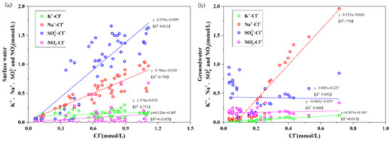 Relationship of Cl− vs. K+, Na+, , and respectively in surface water (a) and groundwater (b).