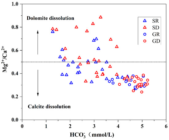 Groundwater in the study area was mainly controlled by carbonate rocks, which mainly include limestone and dolomite, consisting of calcite (CaCO3) and dolomite (CaMg(CO3)2), respectively. Ca2+, Mg2+, and mainly originated from the dissolution of rocks. Limestone dissolves to form Ca2+ and , and dolomite dissolves to form Ca2+, Mg2+, and , while the dissolution rate of limestone is higher than that of dolomite. The dissolution process of groundwater flowing through calcite and dolomite is shown in Equations (4) and (5). When pure calcite dissolution reaches equilibrium, the ratio of Mg2+ to Ca2+ in groundwater is 0. When pure dolomite dissolution reaches equilibrium, the ratio of Mg2+ to Ca2+ in groundwater is 1. When groundwater dissolves calcite and dolomite (Equation (6)), and dissolution reaches equilibrium, the ratio of Mg2+ to Ca2+ in groundwater is close to 0.5 [30].