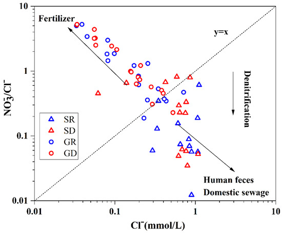 The /Cl− ratio is necessary to eliminate the effects of concentration or hygroscopic effects in groundwater, combined the relationship with Cl− to identify the sources of in groundwater. When the amount of Cl− is high, and that of /Cl− was low, the main sources of in groundwater are manure and domestic sewage. When the amount of /Cl− is high, and that of Cl− was low, the main sources are chemical fertilizers [32]. Figure 10 shows that most groundwater samples in the study area were mainly distributed in the area of low Cl− mass concentration and high /Cl− ratio, indicating that in groundwater mainly came from chemical fertilizers. Besides, the distribution of samples was fragmented with large differences in the degree of influence by chemical fertilizers. However, the surface water samples were mainly distributed in the area of high Cl− mass concentration and low /Cl−—ratio, indicating that in surface water was mainly from human waste and domestic sewage.
