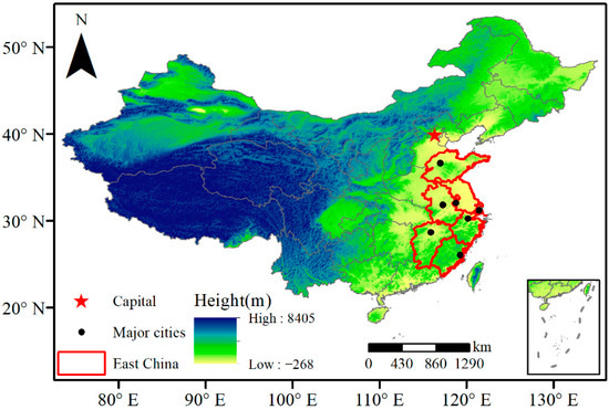 From the north to the south, East China includes Shandong, Jiangsu, Anhui, Shanghai, Zhejiang, Jiangxi, and Fujian Provinces, of which Jiangxi Province is the largest and Shanghai is the smallest. The area of East China (834,300 km2) accounts for approximately 8.7% of the total area of China. Southern parts of East China are dominated by hills and mountains, while northern parts are comparatively flat and largely dominated by plains. East China has a subtropical humid monsoon climate and a temperate monsoon climate. The climate of East China is divided in the region of the Huaihe River; areas to the north have a temperate monsoon climate, while areas to the south have a subtropical monsoon climate (Figure 1). Annual average temperature in East China is 15−18 °C.
