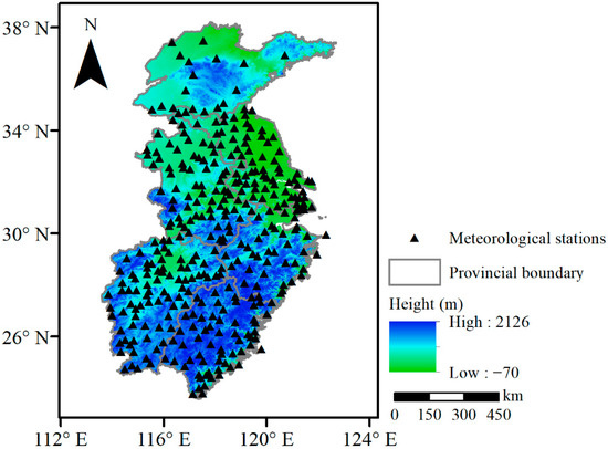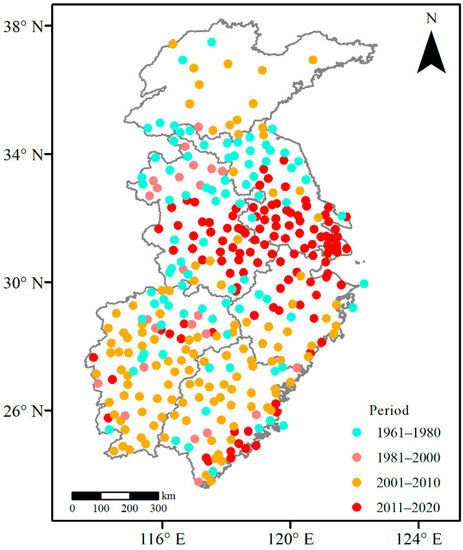 The data used in this study were derived from the National Meteorological Information Center of the China Meteorological Administration, which issues quality-controlled DMT datasets (Figure 2). High-elevation stations (>800 m above sea level) and stations with missing records, blank data, or an anomaly rate of >1% in the corresponding period were excluded for quality control reasons. Ultimately, DMT data from 345 national ground meteorological stations in East China were selected as basic data. To obtain equal-length data samples and to facilitate statistical analyses, we selected daily data from January 1961 to December 2020, with the mean values of the most-recent 30 years (1991–2020) designated as normal year values. Then, anomaly values were calculated from the differences between historical values and normal year values. Significance testing of the linear trends and correlation coefficients was performed following a previous study [29]. The atmospheric circulation data were selected from the 200, 500, and 700 hPa geopotential height fields, horizontal wind field, and other variables of the July–August NCEP/NCAR reanalysis data, with the horizontal resolution of 2.5° × 2.5°.