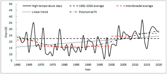 Interannual variation in the annual number of extreme maximum temperature event (EMTE) days in East China during the period 1961–2020 (red dashed line indicates the decadal mean).