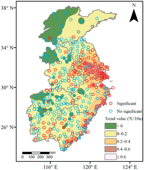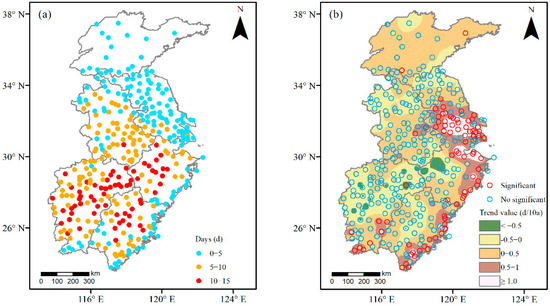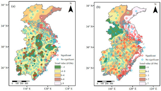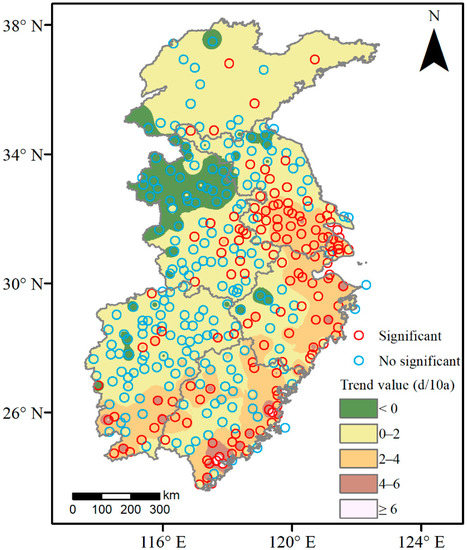 Based on the linear variation trends for the previous 60 years, the mean first day advanced by 1–10 days in most areas of the study region, except northern Jiangsu and most areas of Shandong. The rate of advance in some areas passed the t-test at a significance level of 0.05. Additionally, the mean last day became delayed by 1–10 days in most areas of East China, but by 10–20 days in eastern coastal areas. The rate of delay in most areas passed the t-test at a significance level of 0.05 (Figure 10).